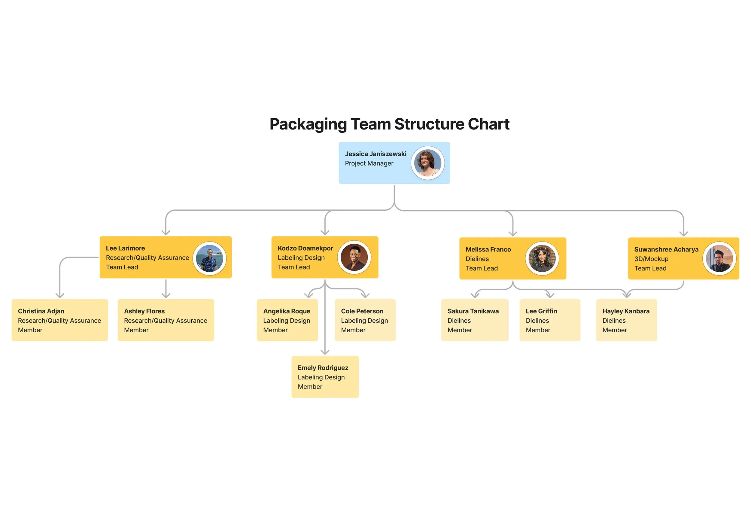 Chart showing packaging sub-teams: Research/QA, Dieline, Label Design, and 3D Mockup.