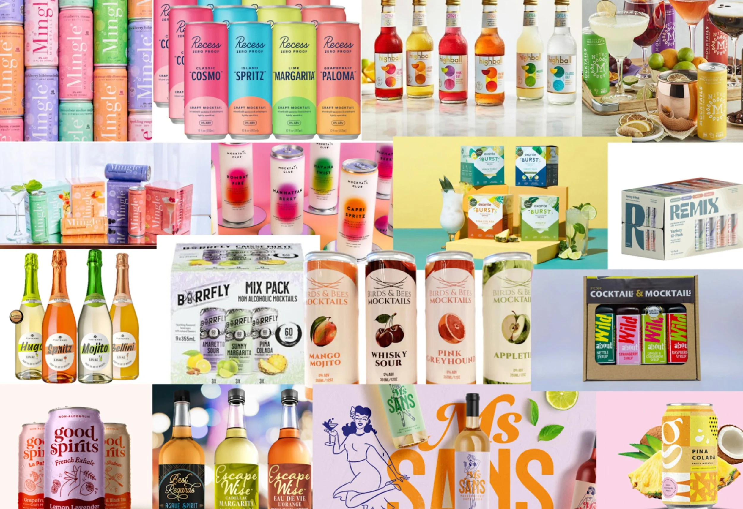Moodboard collage of bottles, cans, and imagery used to guide packaging design direction.