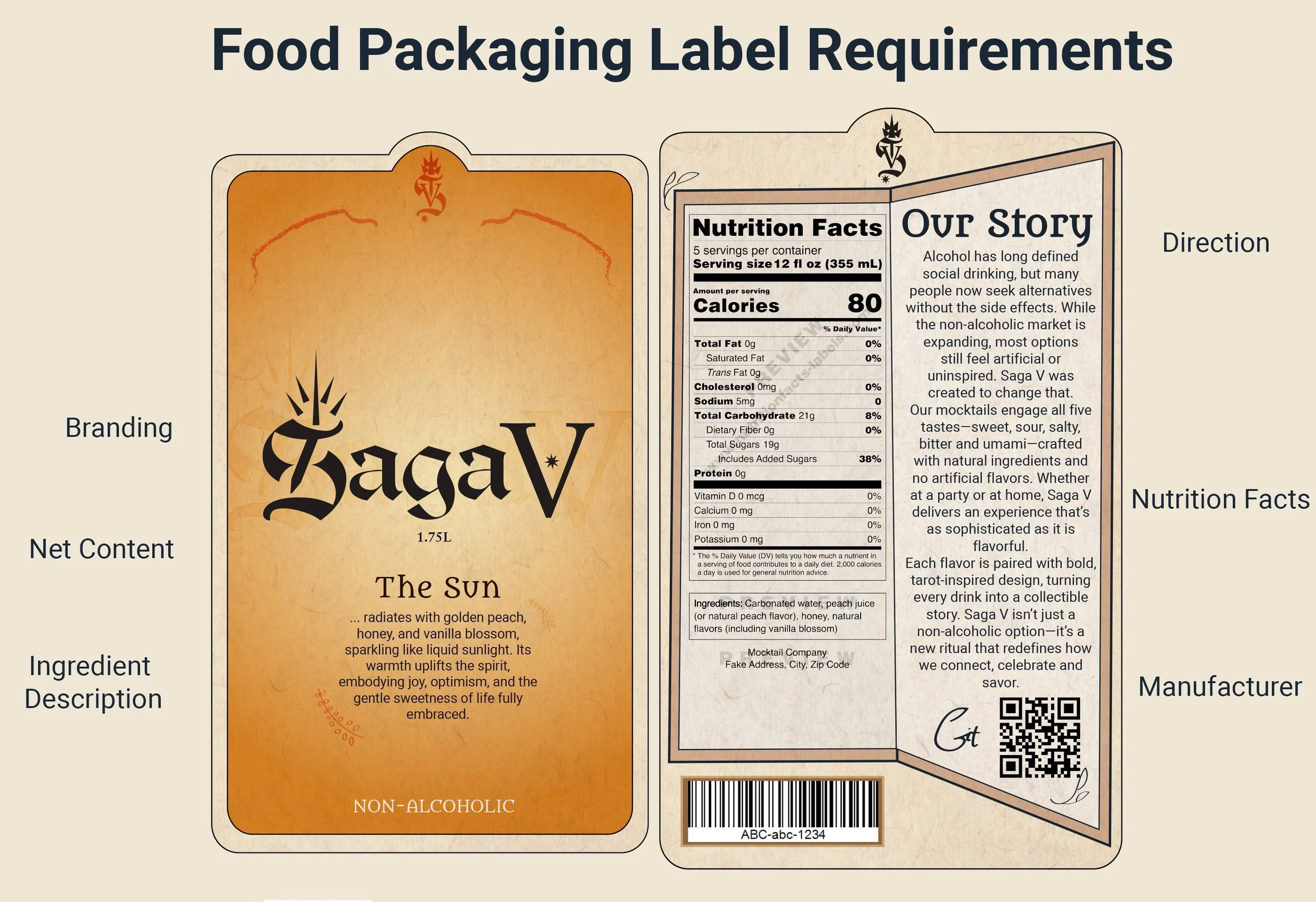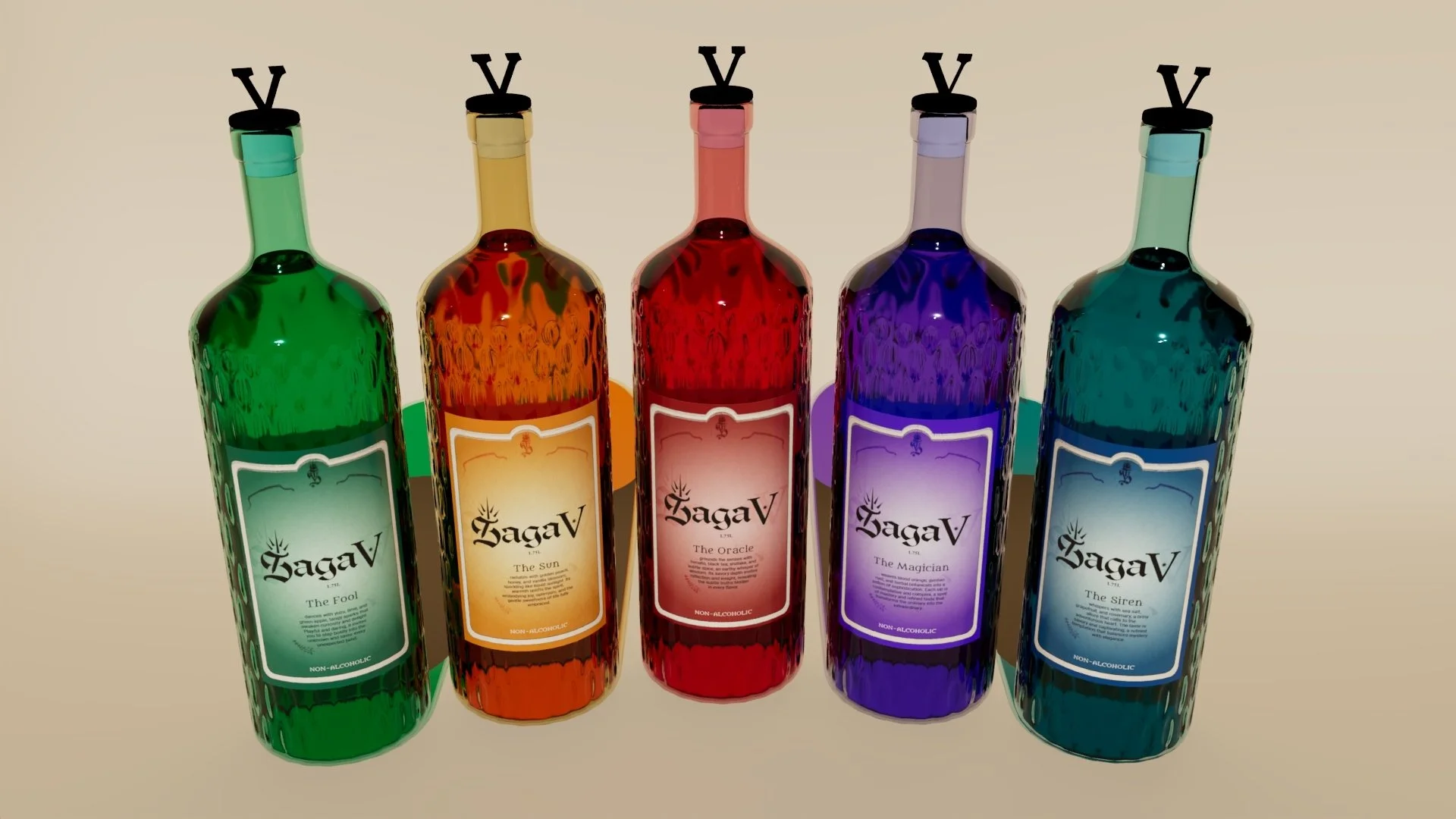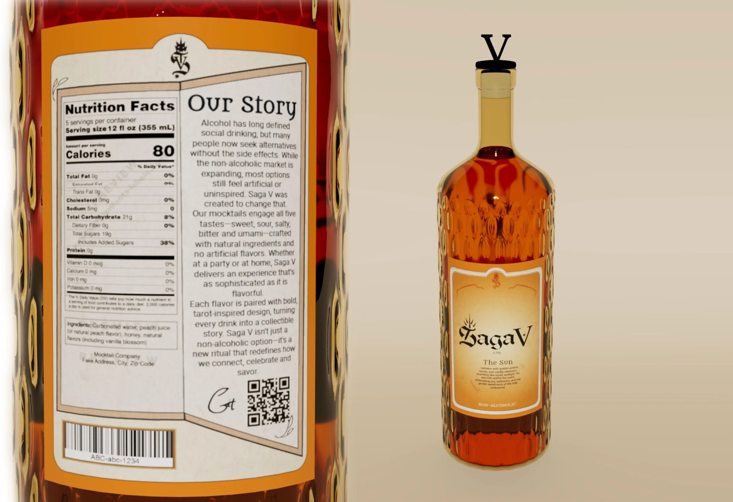 3D mockup of a mocktail bottle featuring the Saga V label design. The label displays the brand logo, modern typography, and a color palette that reflects the mocktail’s flavor and identity.
